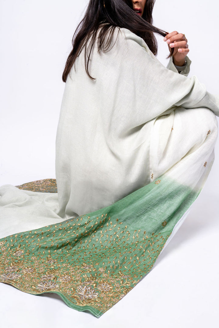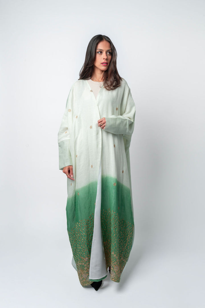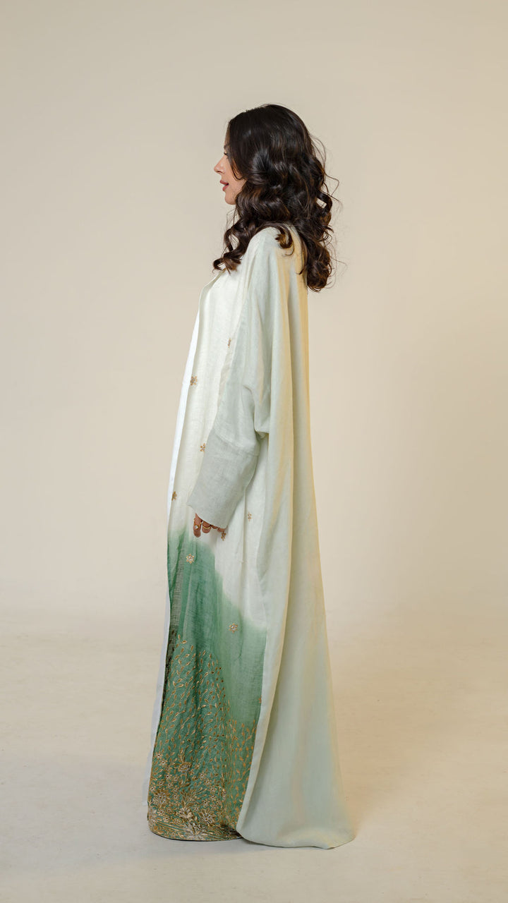 A serene ivory abaya gently fading into soft green hues, delicately adorned with golden floral embroidery. Its fluid silhouette and lightweight fabric create an effortless elegance for any refined occasion.