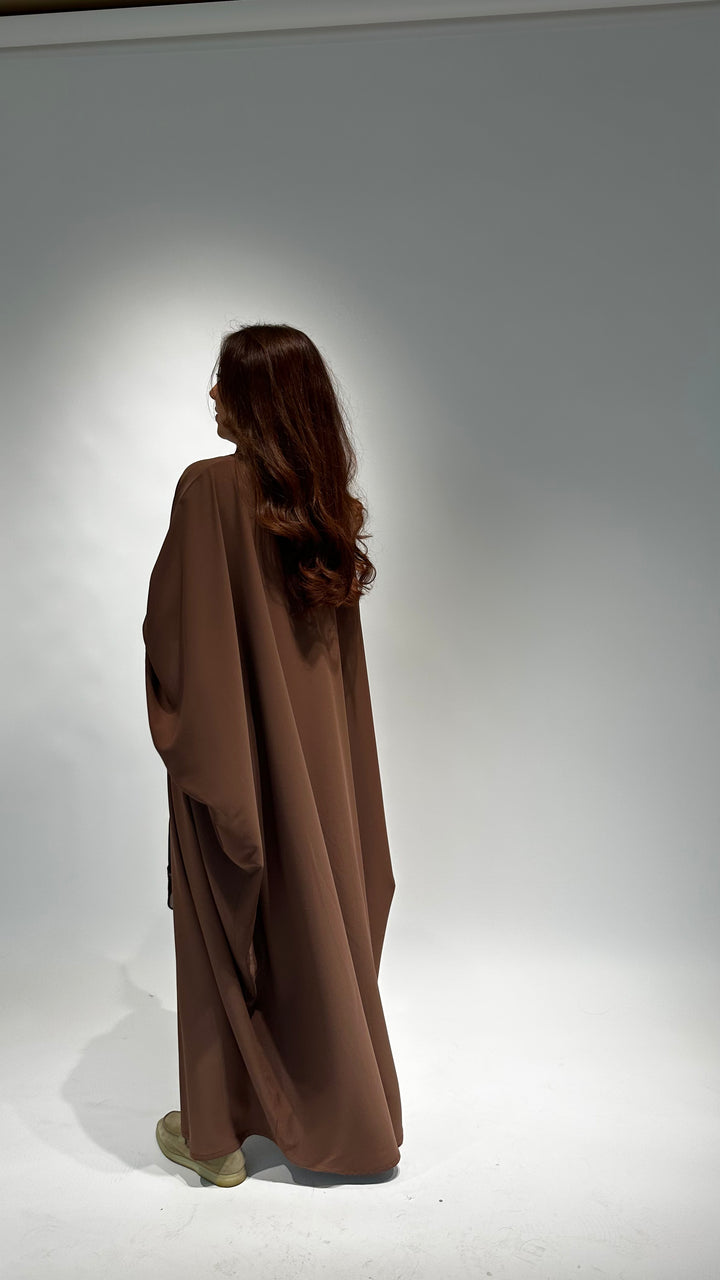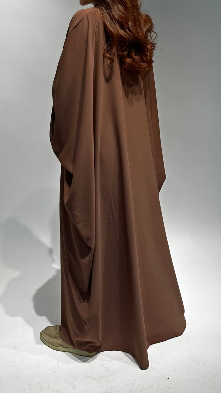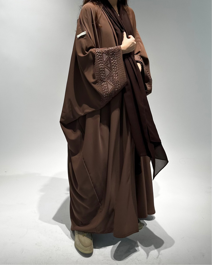 This abaya comes in a warm chocolate brown shade with detailed textured embroidery on the sleeves. The fabric is soft and flowy, making it perfect for daily wear or modest chic outings. A calm, earthy look with elegant sleeve work.