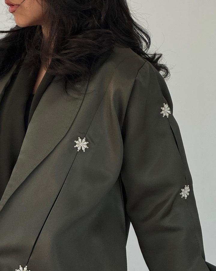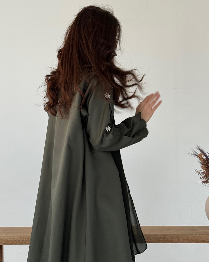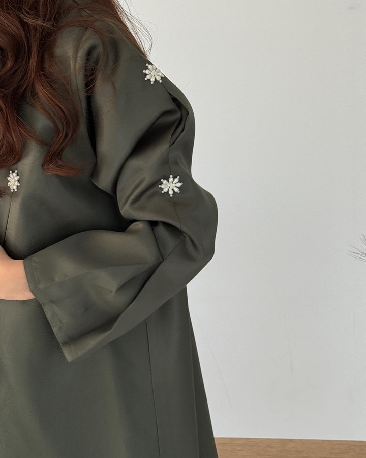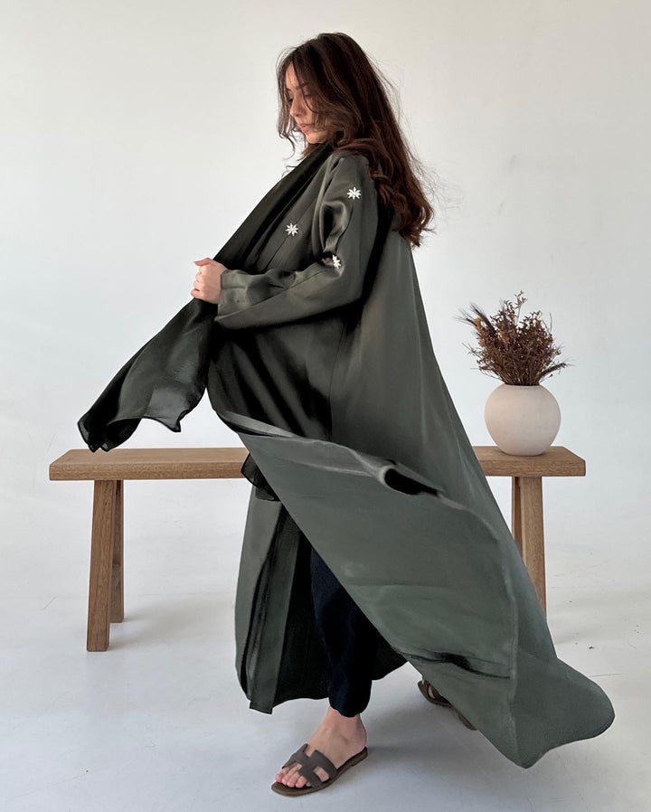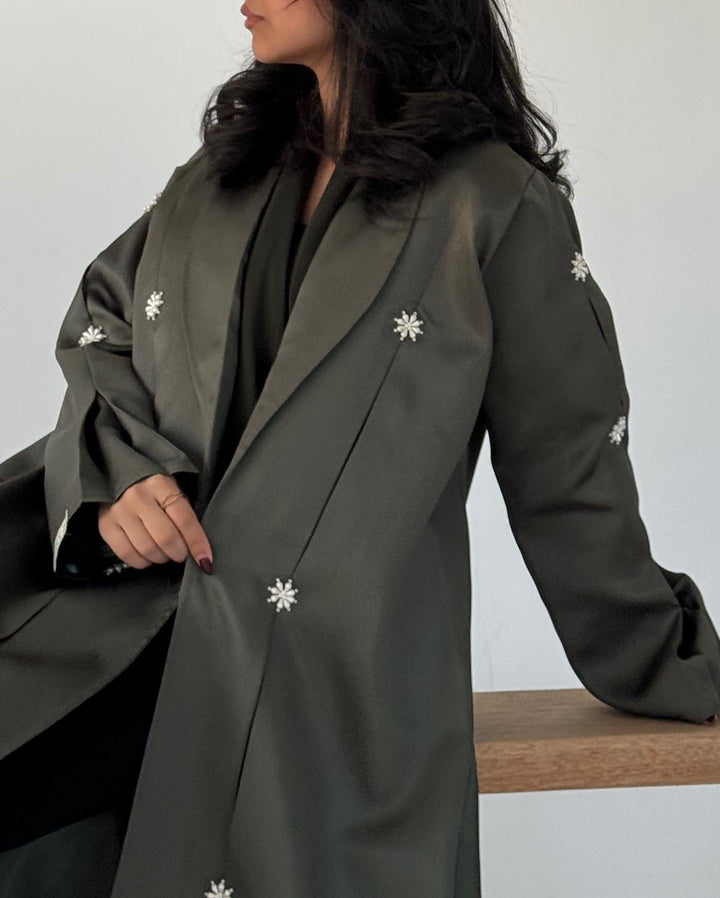 A classy abaya made from rich tfta fabric with a soft shine. The floral embellishments add a delicate, elegant touch. Perfect for formal days, evening outings, or special gatherings – this abaya blends luxury with simplicity.