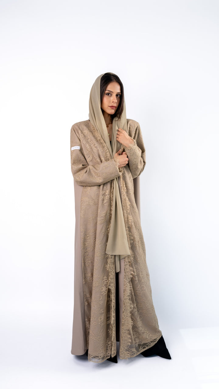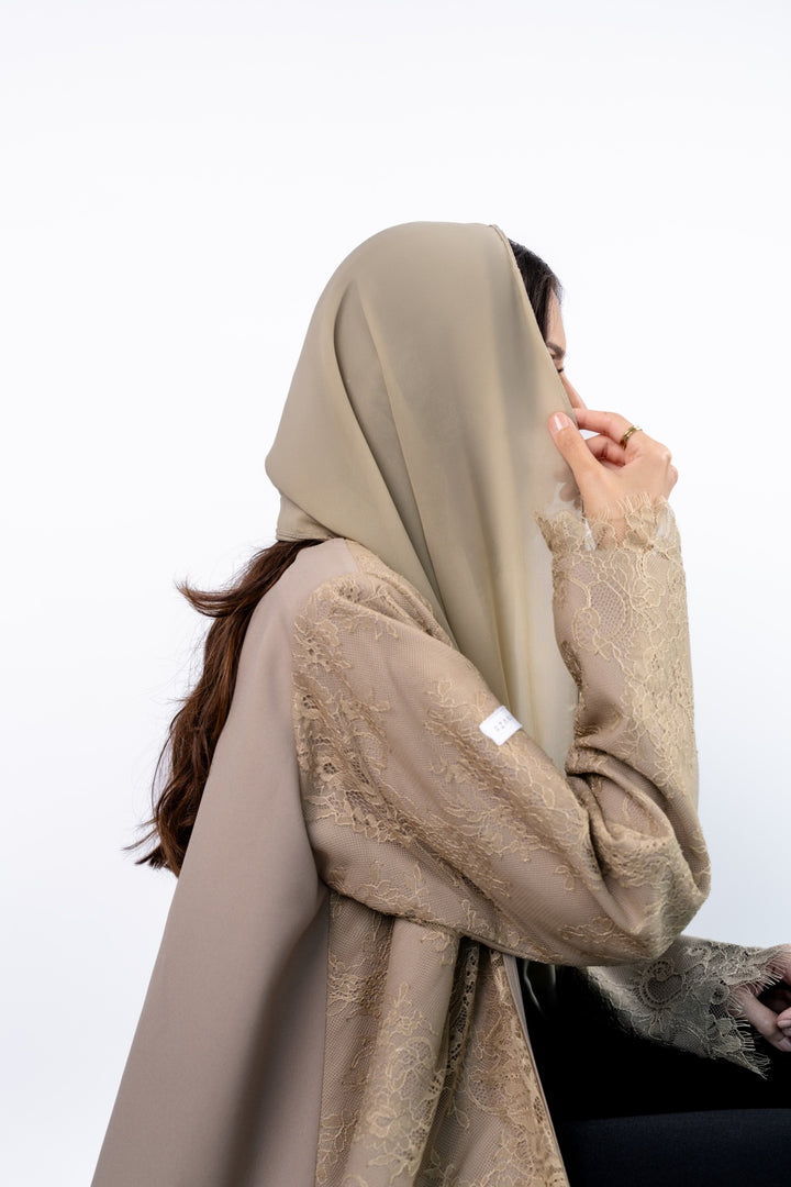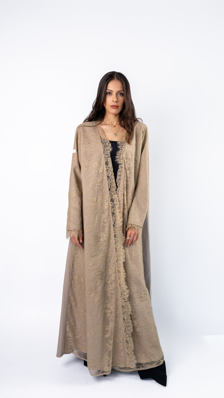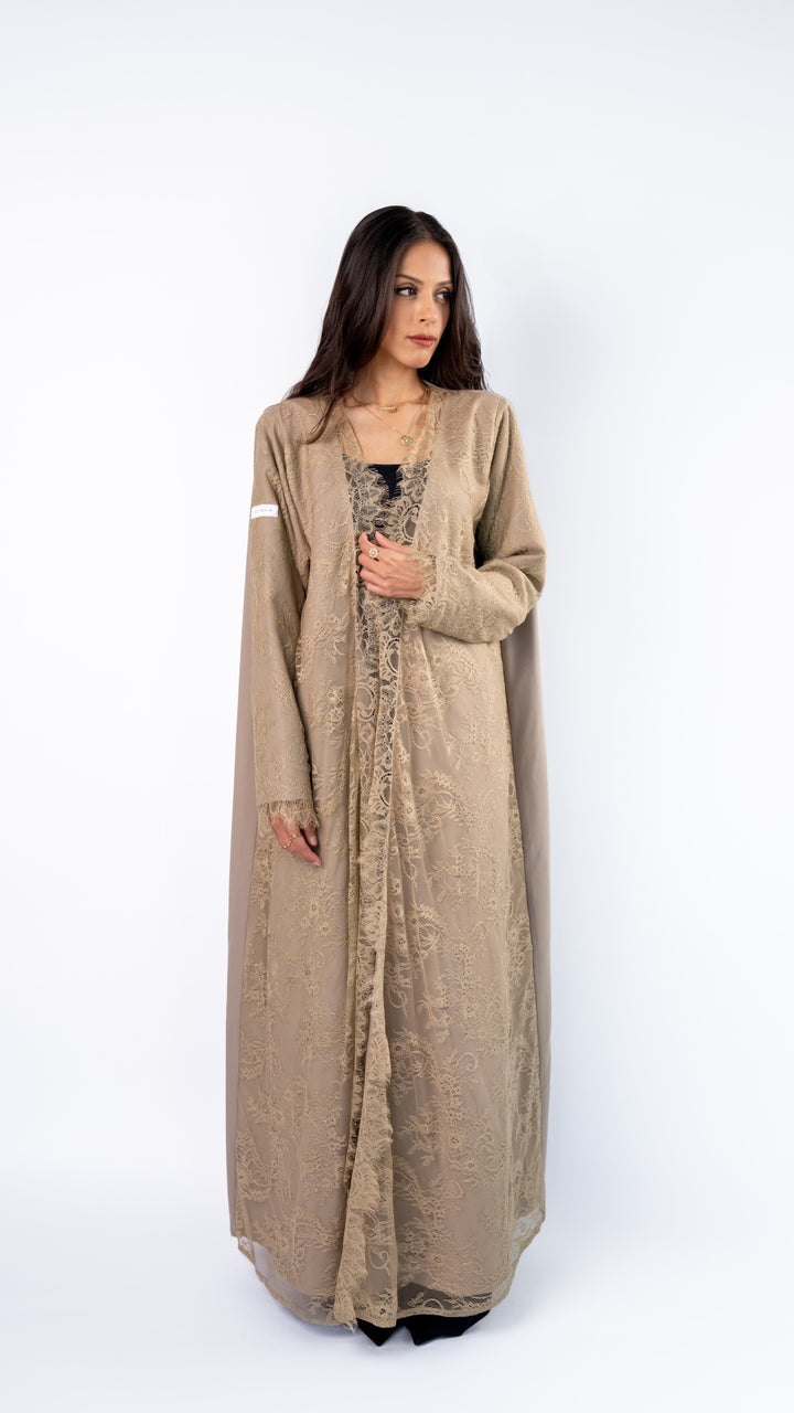 Soft, graceful, and versatile—this sand beige lace abaya offers a modern twist on classic modest wear. Suitable for upscale gatherings or professional settings.