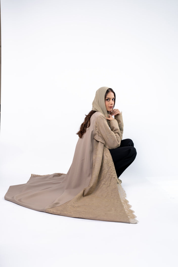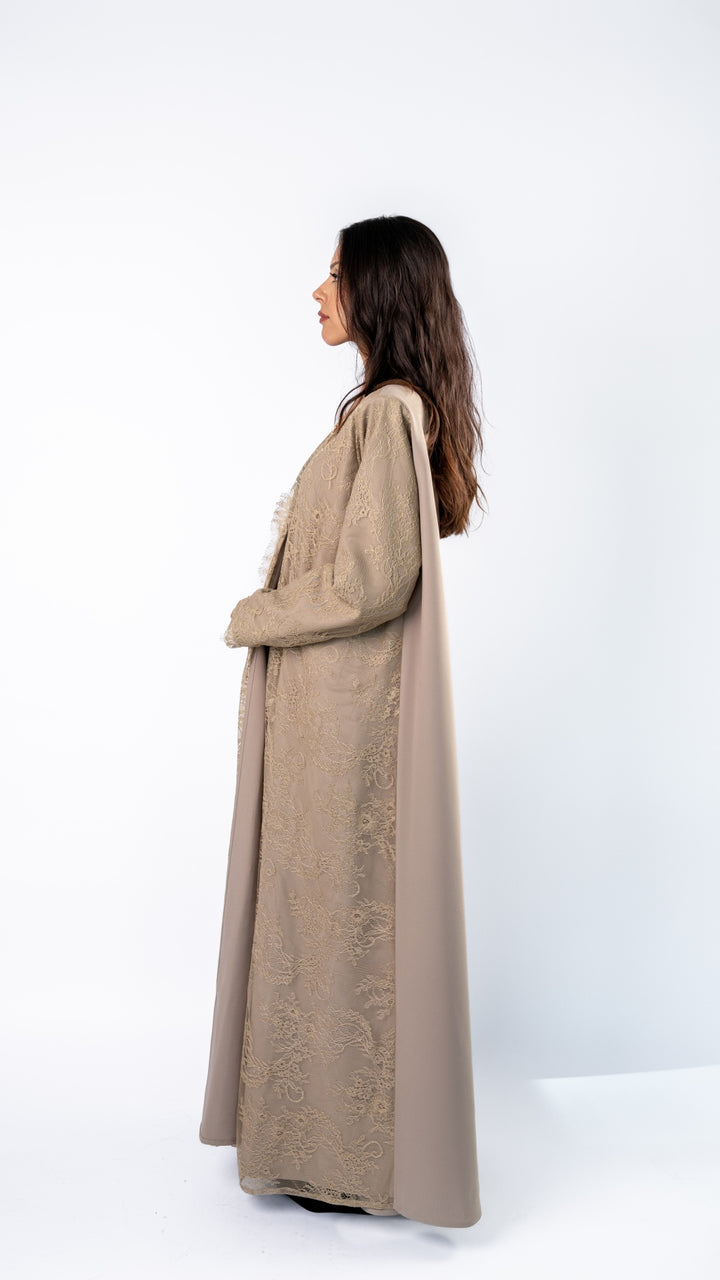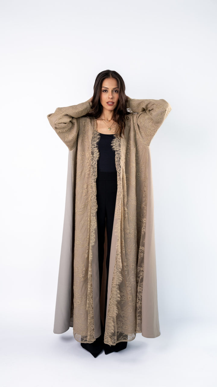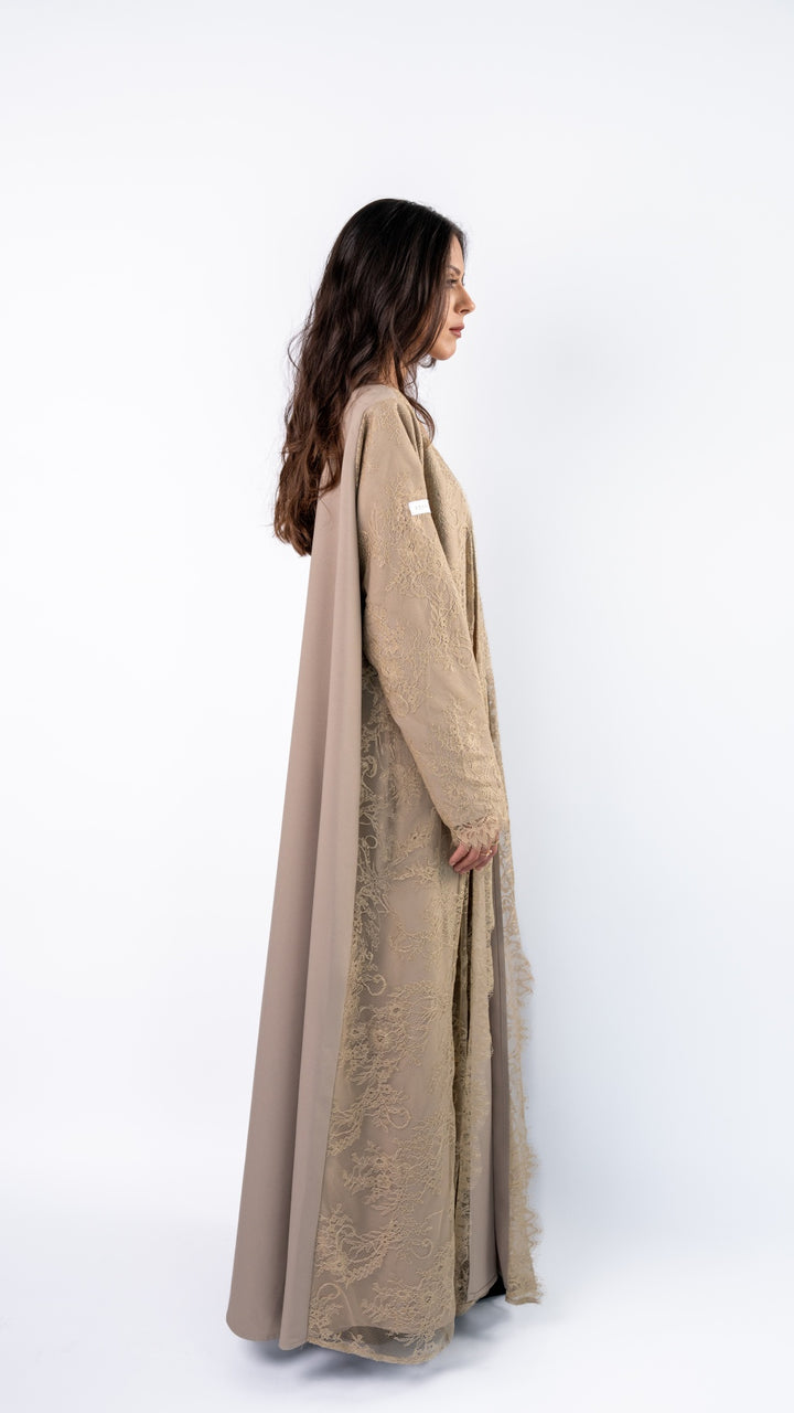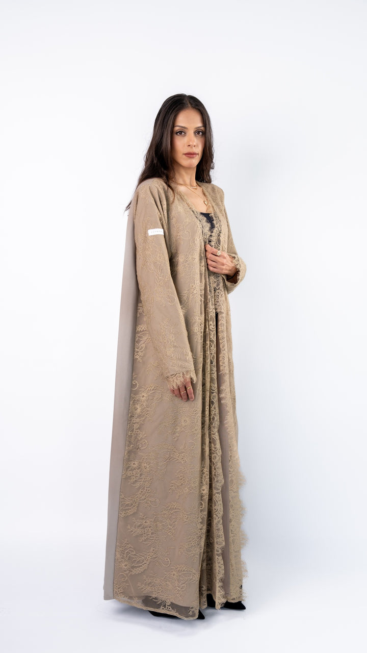 Soft, graceful, and versatile—this sand beige lace abaya offers a modern twist on classic modest wear. Suitable for upscale gatherings or professional settings.