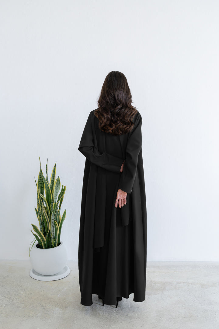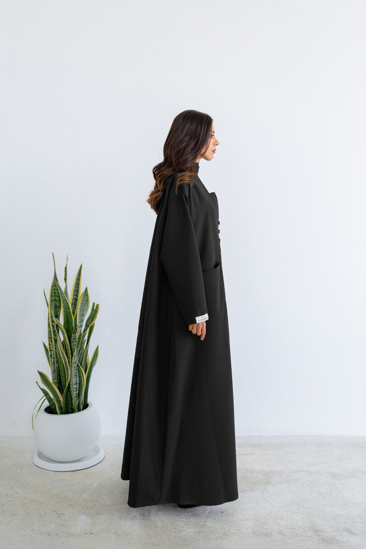 A refined olive abaya that stands out with its unique square-cut neckline and delicate button details. The Olive Muse combines understated elegance with modern design, making it perfect for formal occasions, professional gatherings, or an elegant dinner outing.