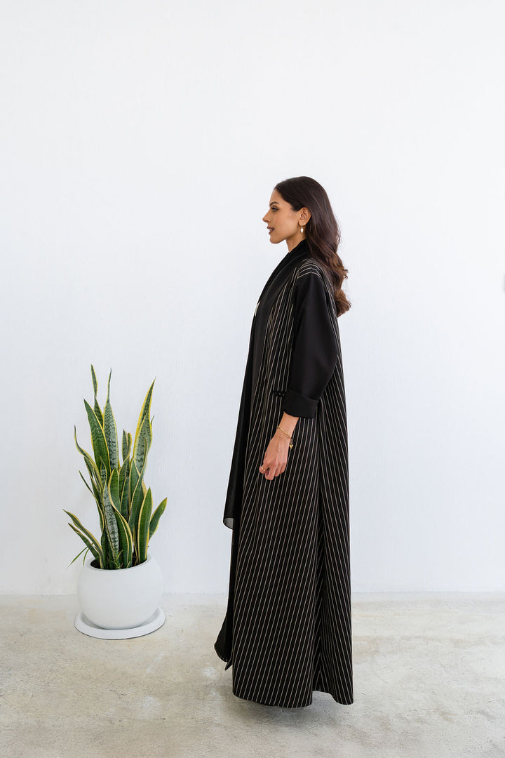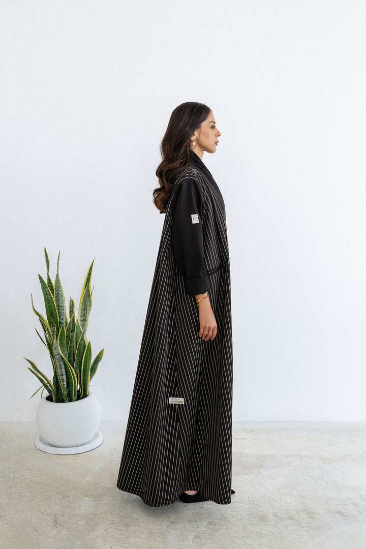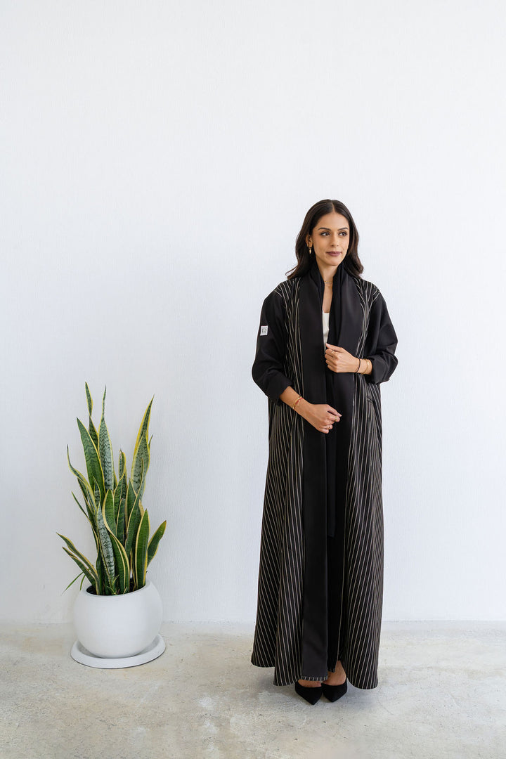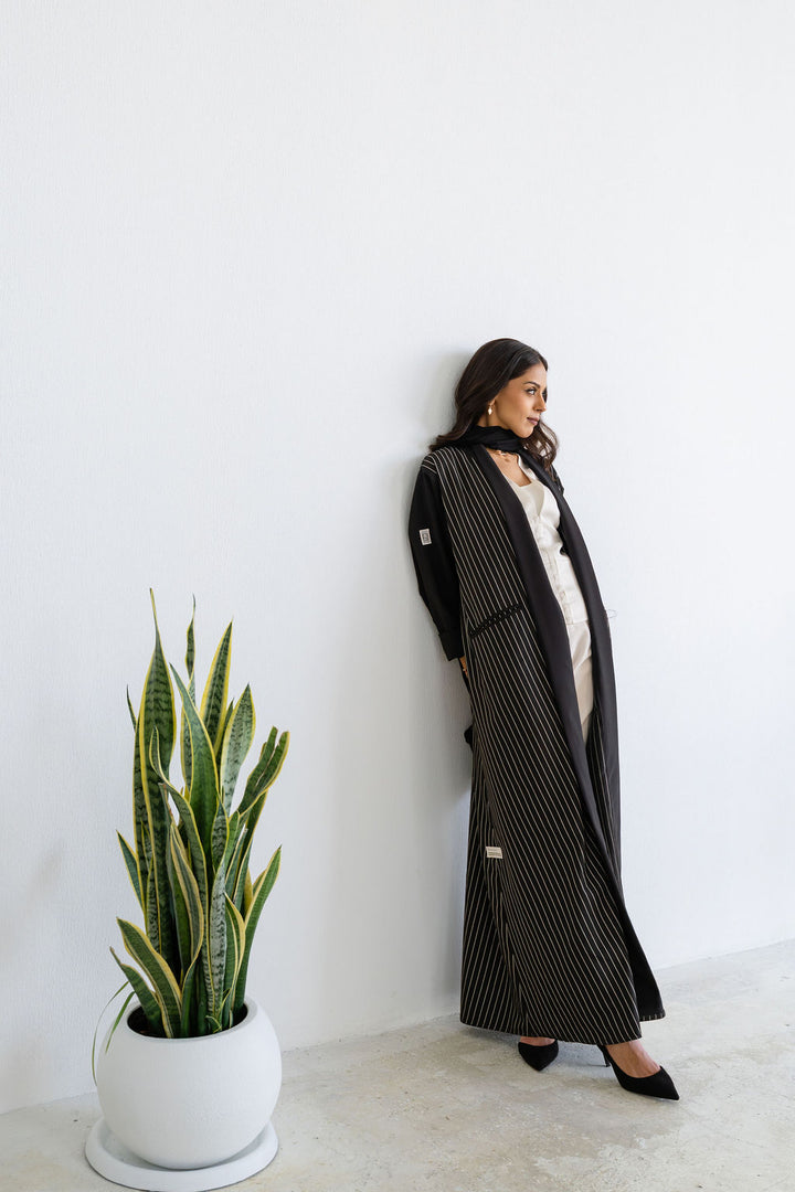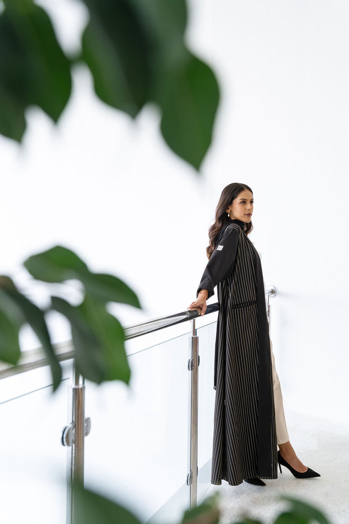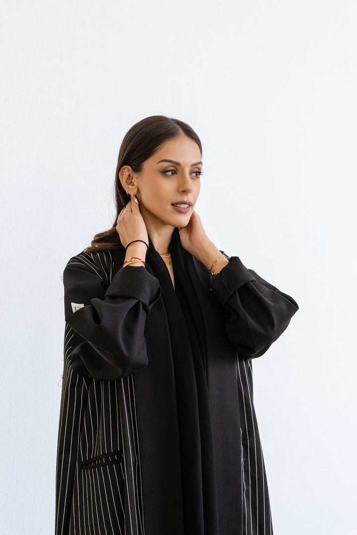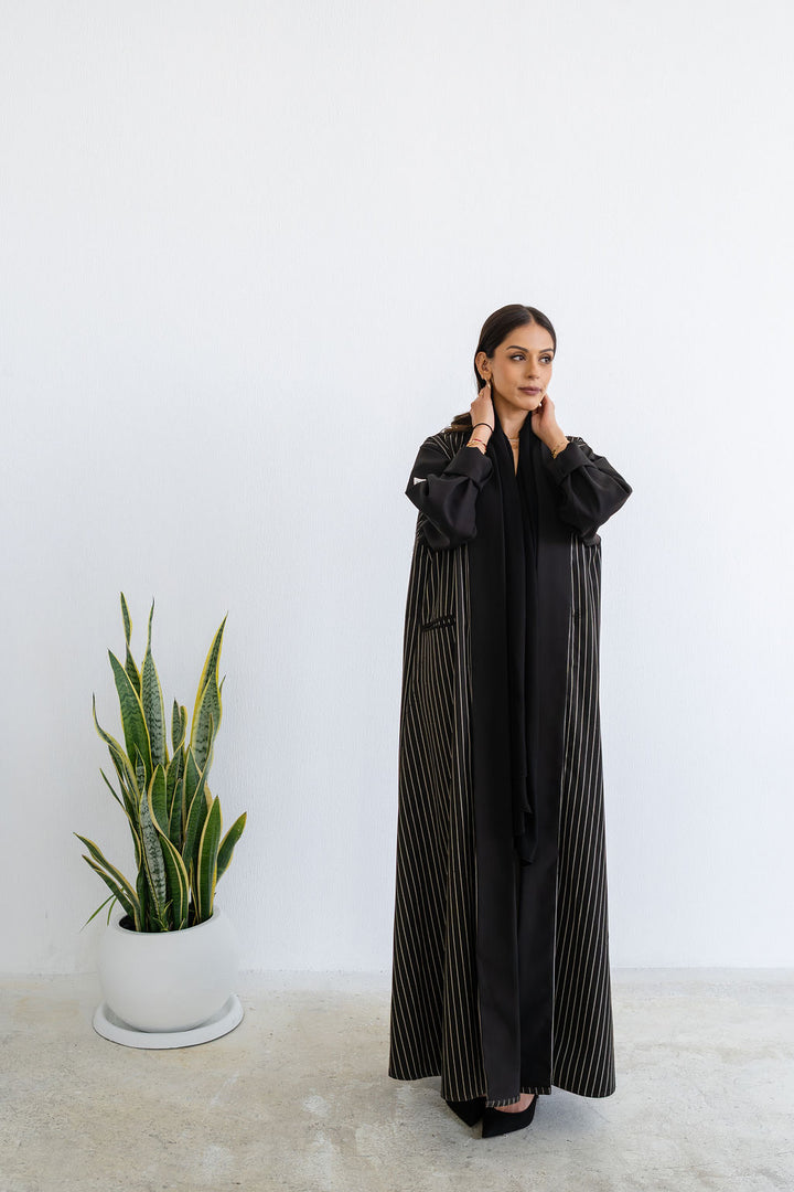 Designed with precision and ease, the V-Line abaya combines a formal look with light, breathable comfort. Its flowing striped fabric creates an elegant silhouette that feels effortless for everyday wear yet polished enough for professional and formal settings.