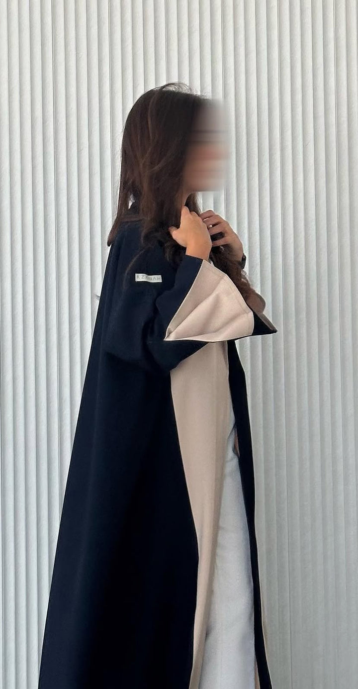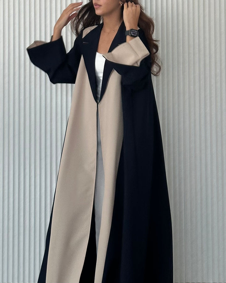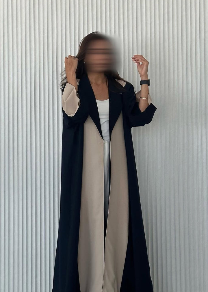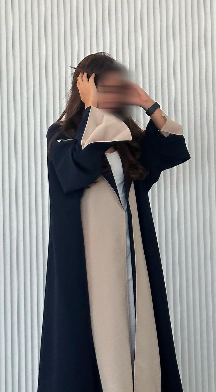 A striking color-block abaya in classic beige and navy blue. The bold contrast and clean cut give it a smart, modern look – perfect for workdays, meetings, or stylish outings....